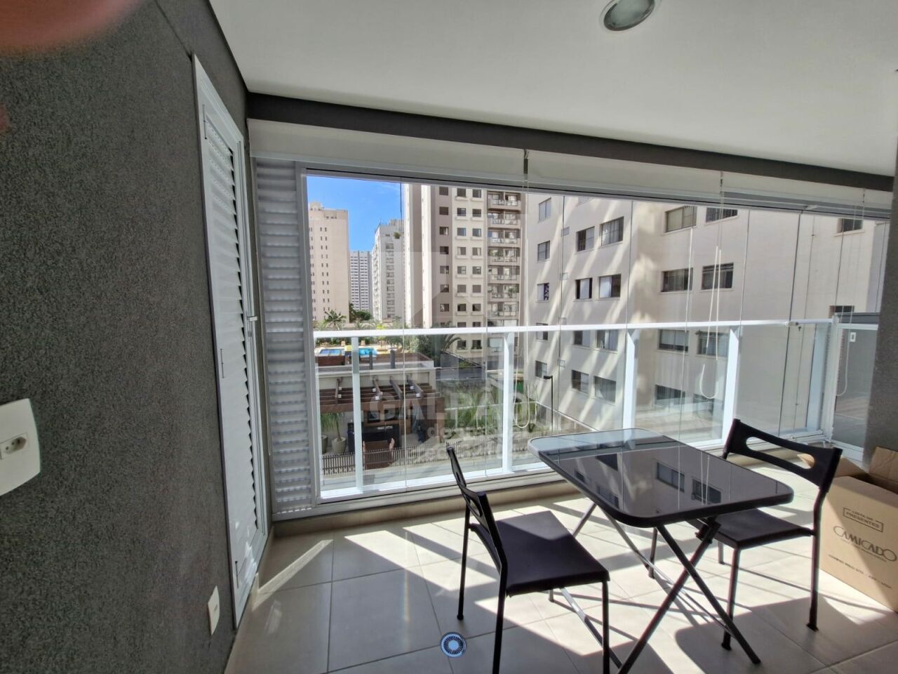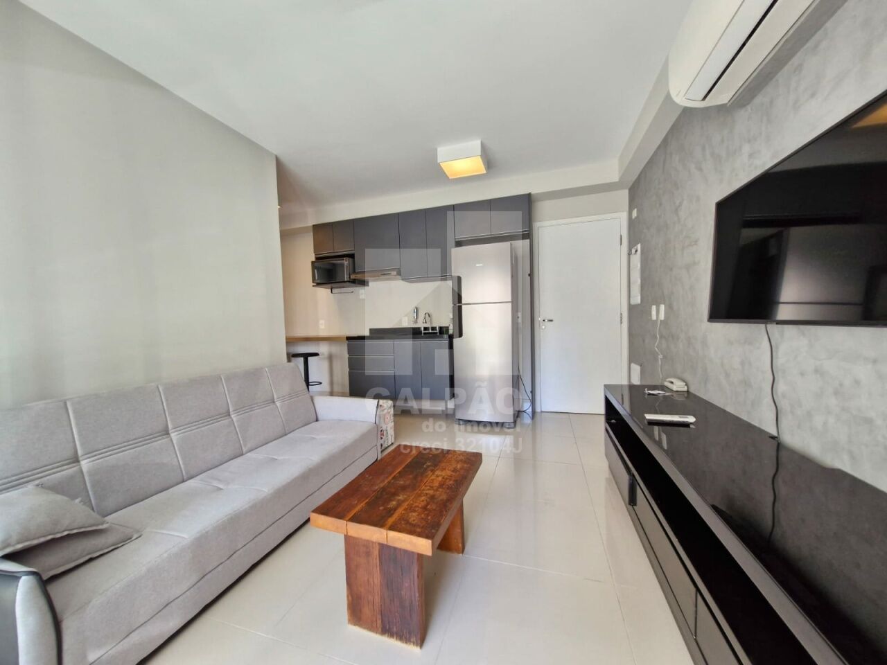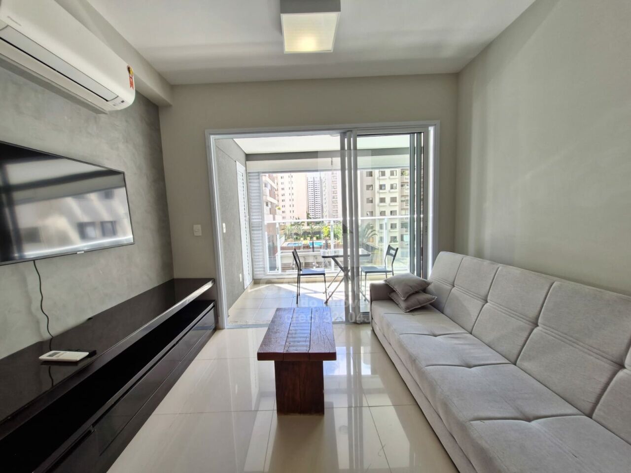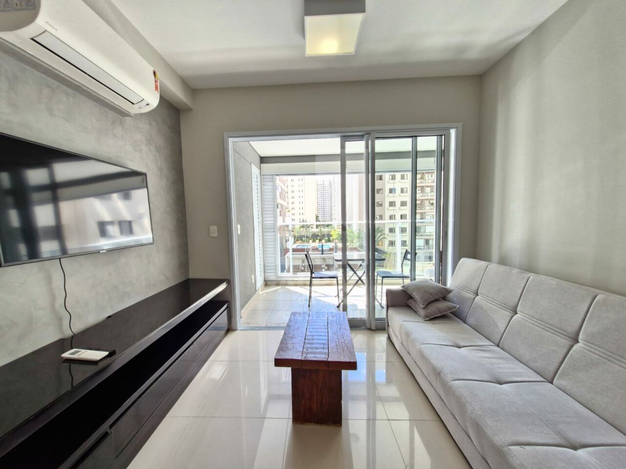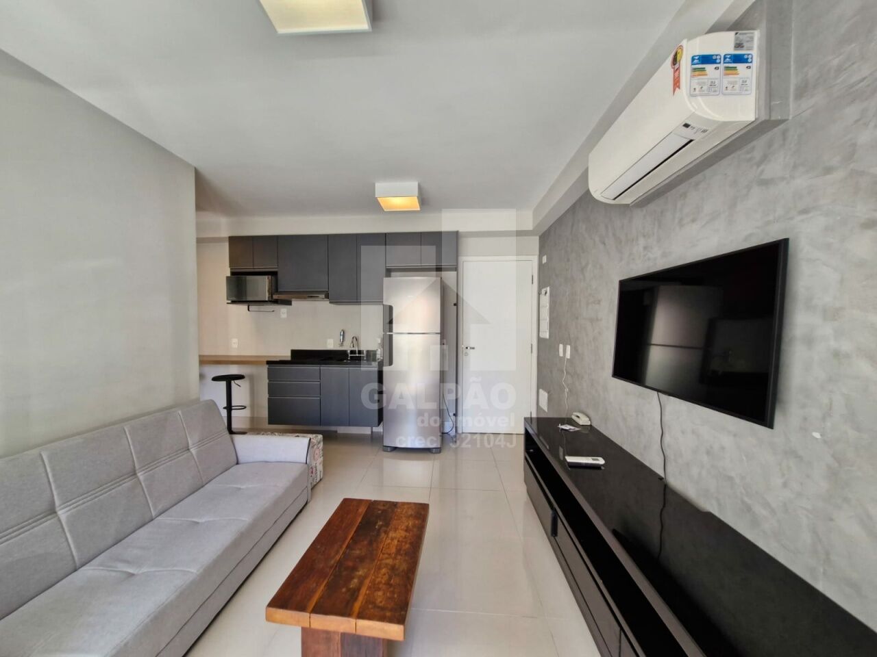 Sala com ar condicionado, varanda envidraçada com sol da manhã, cozinha americana equipada, quarto com armário e ar condicionado, banheiro completo e com armário, 1 vaga de garagem.