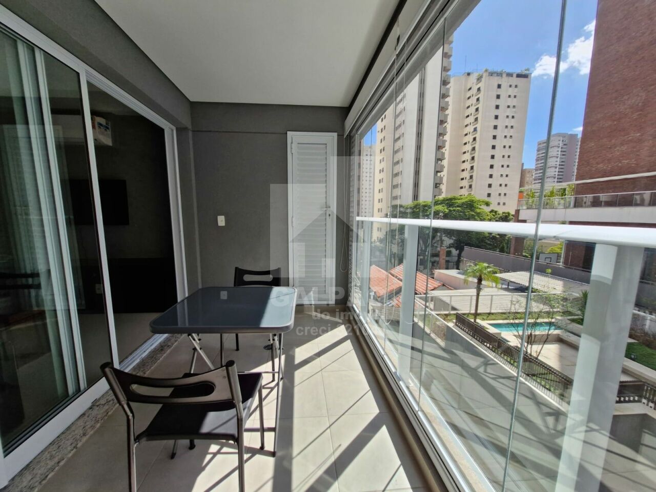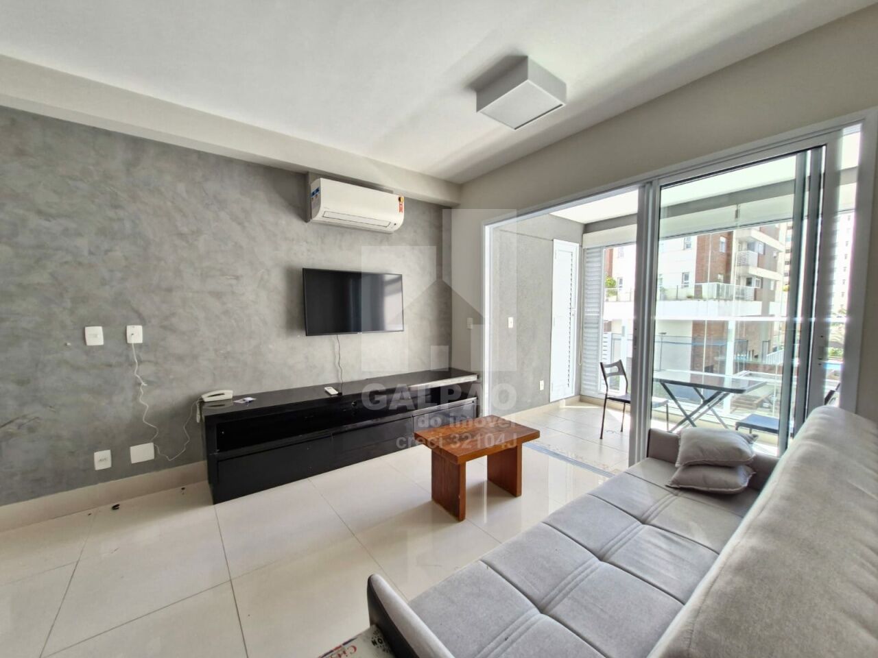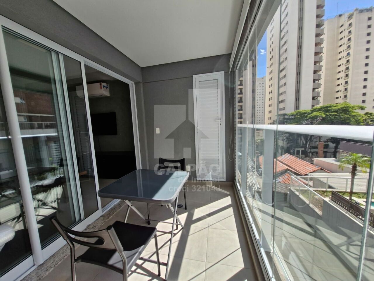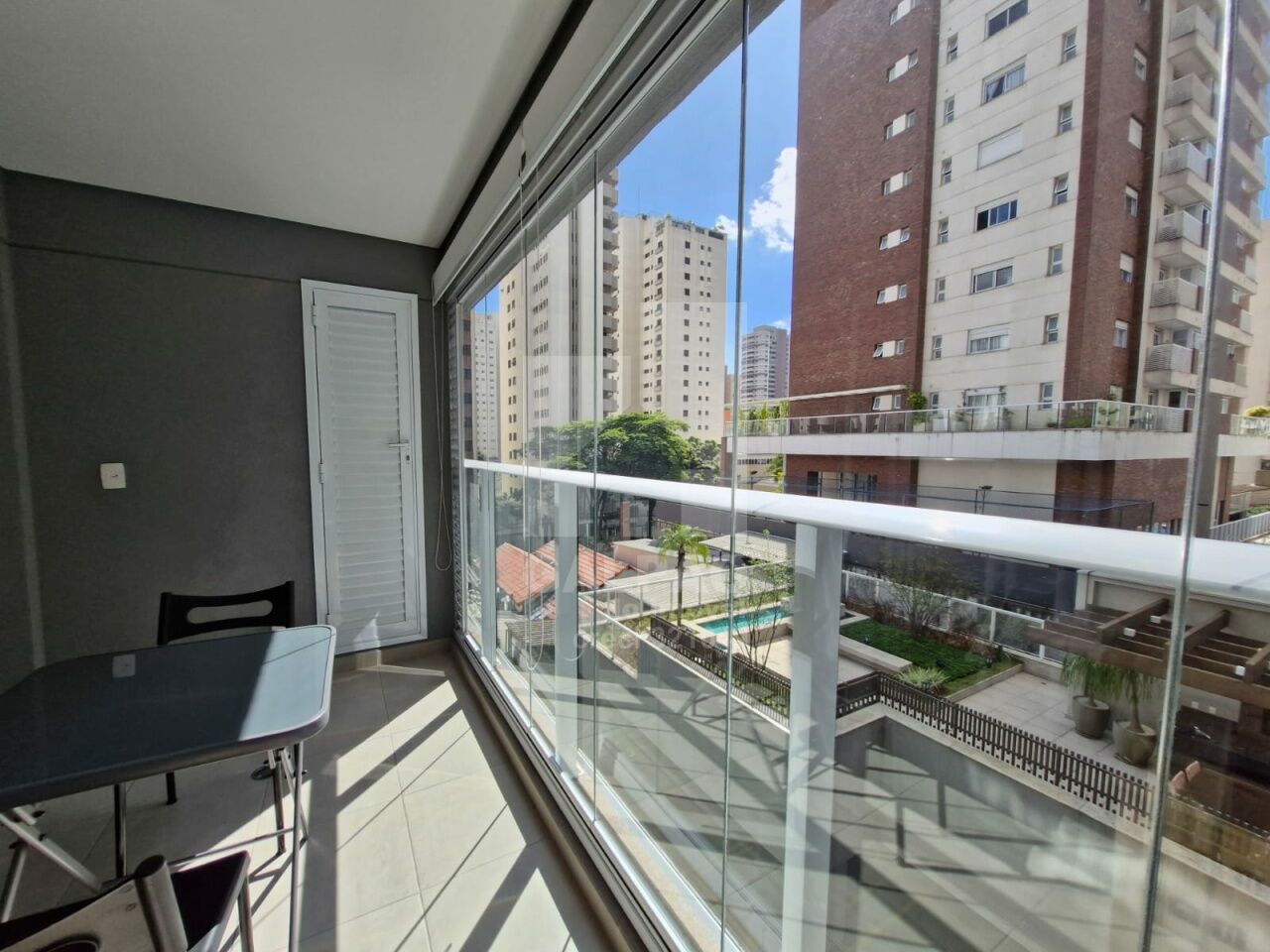 Sala com ar condicionado, varanda envidraçada com sol da manhã, cozinha americana equipada, quarto com armário e ar condicionado, banheiro completo e com armário, 1 vaga de garagem.