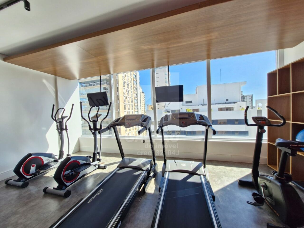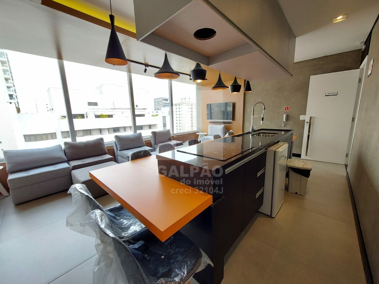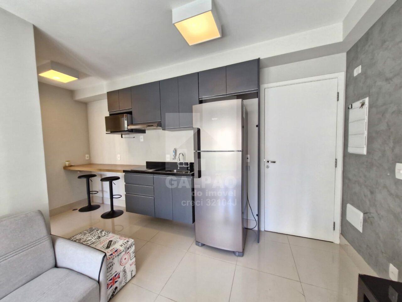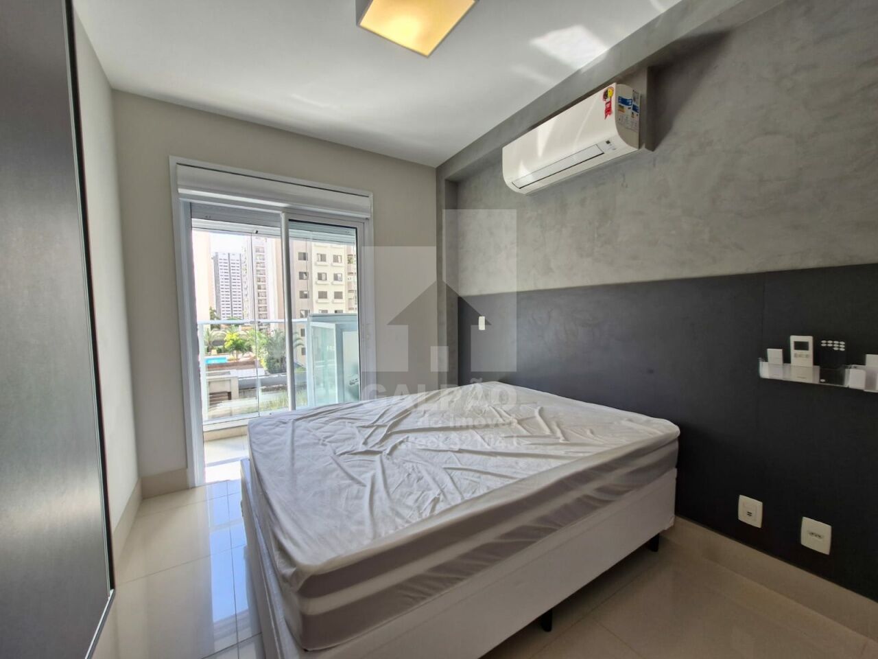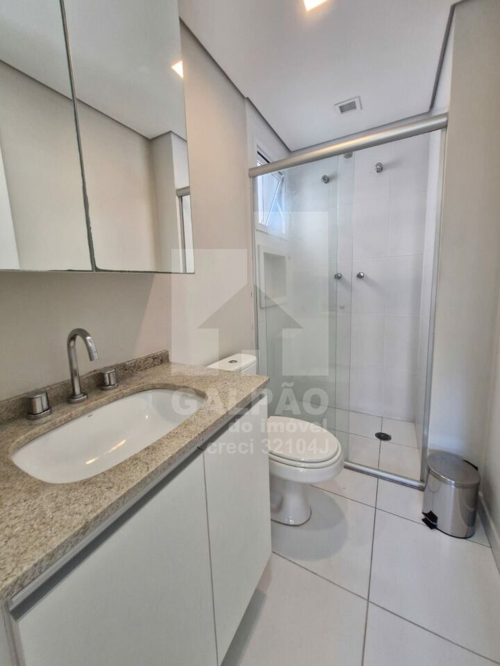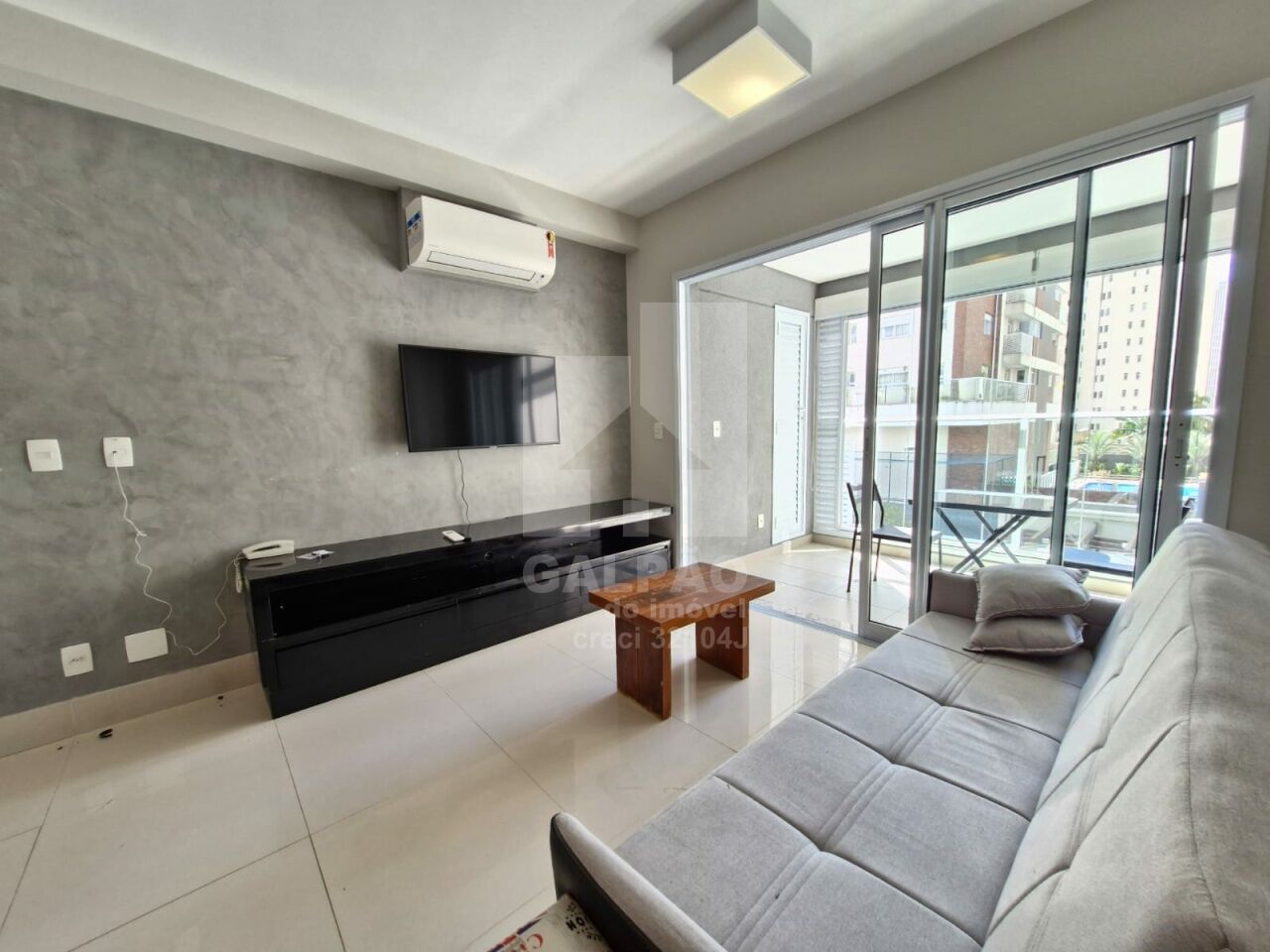 Sala com ar condicionado, varanda envidraçada com sol da manhã, cozinha americana equipada, quarto com armário e ar condicionado, banheiro completo e com armário, 1 vaga de garagem.