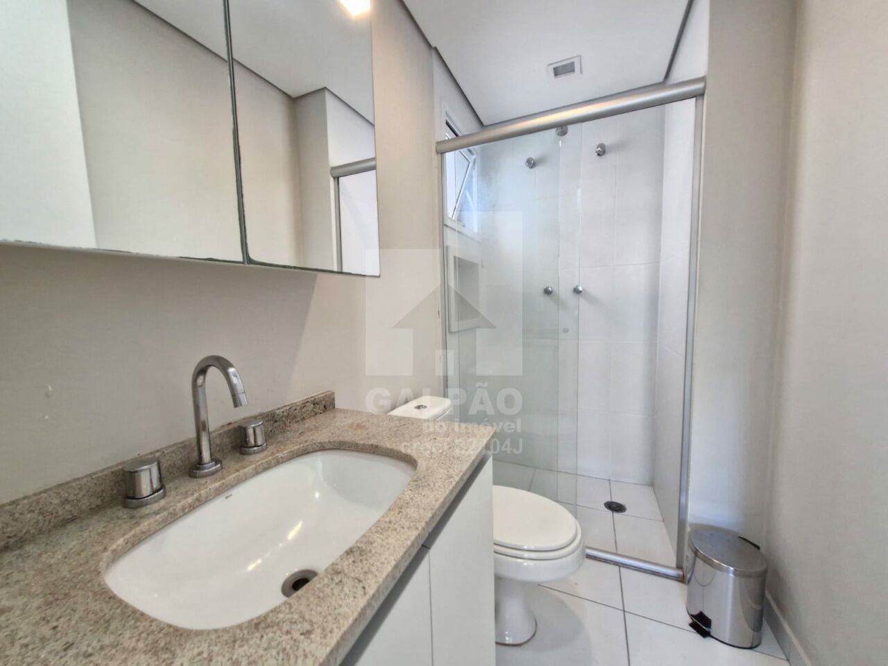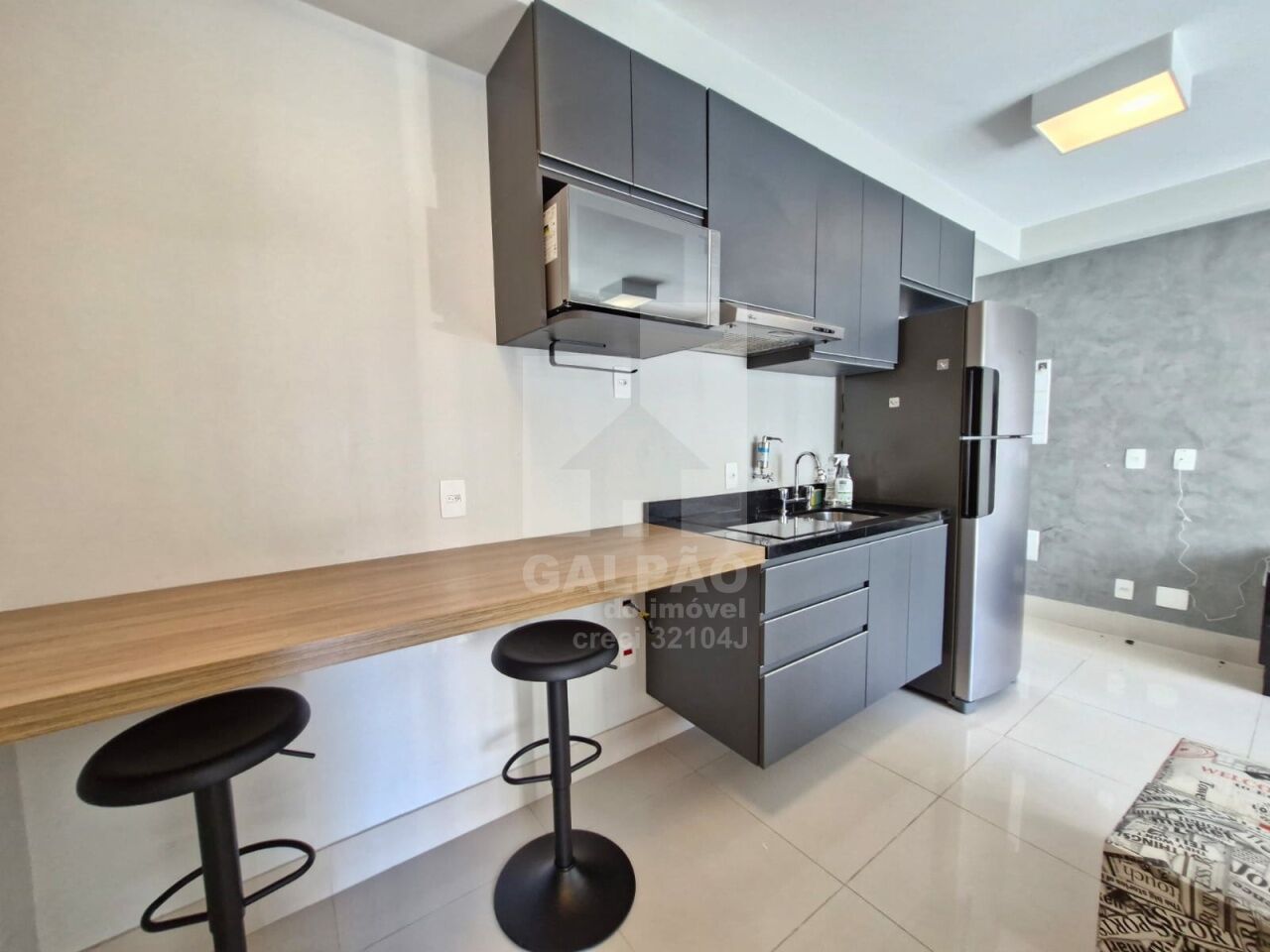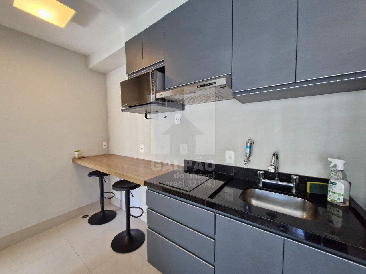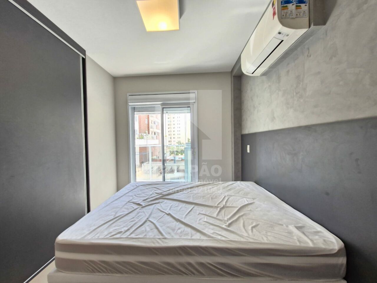 Sala com ar condicionado, varanda envidraçada com sol da manhã, cozinha americana equipada, quarto com armário e ar condicionado, banheiro completo e com armário, 1 vaga de garagem.