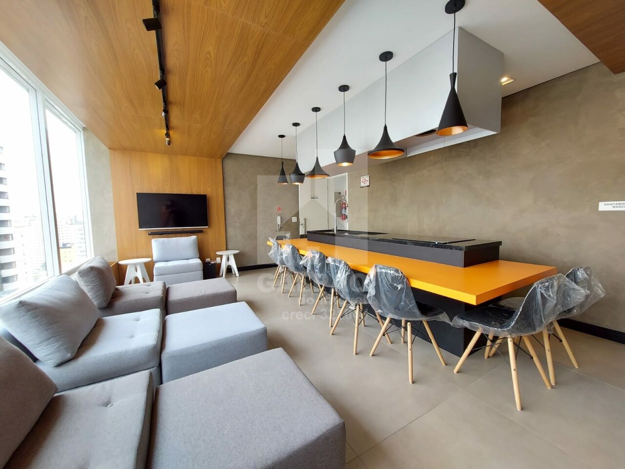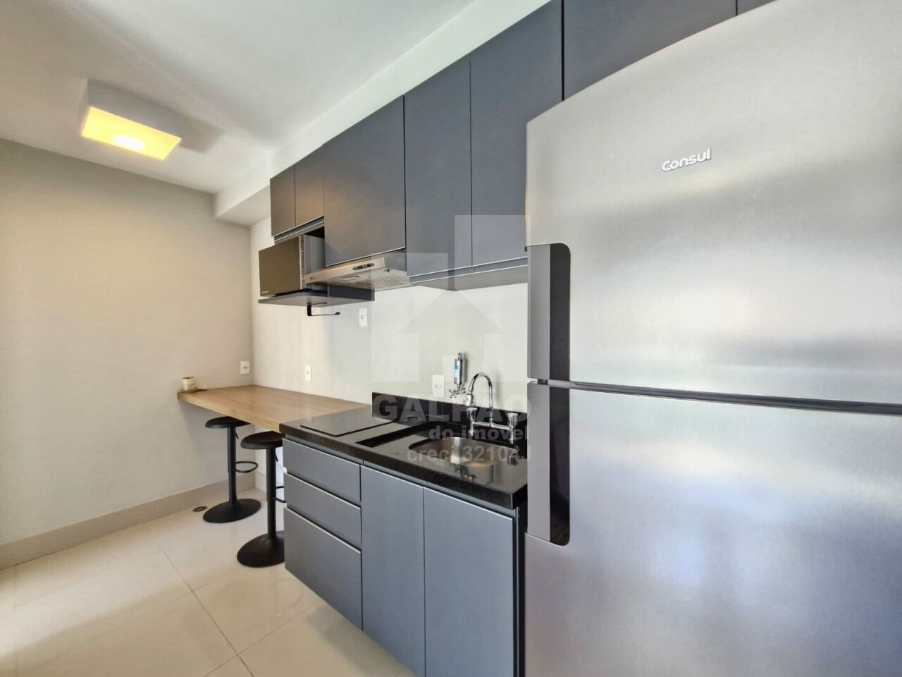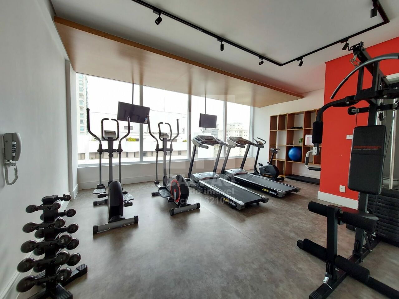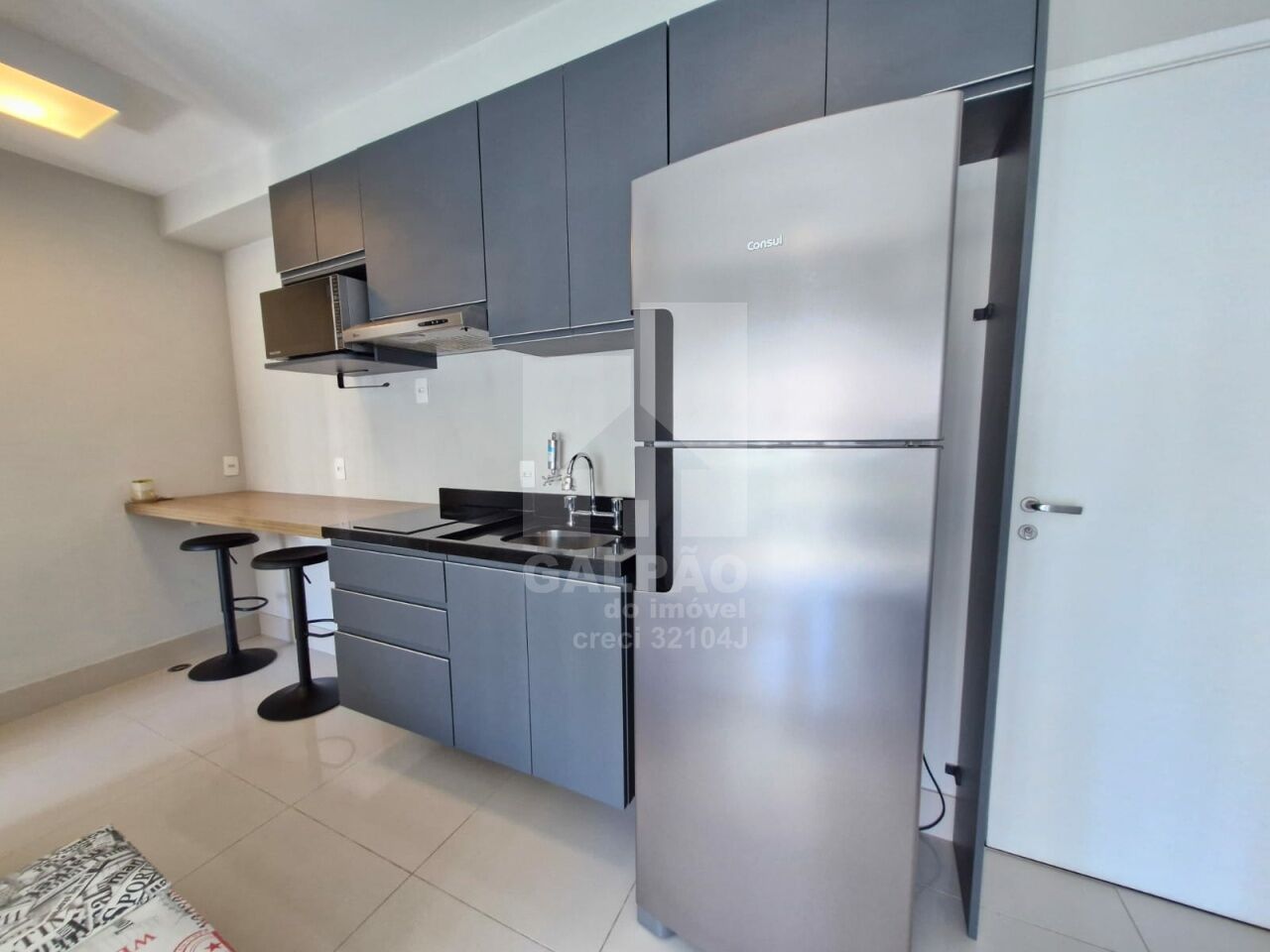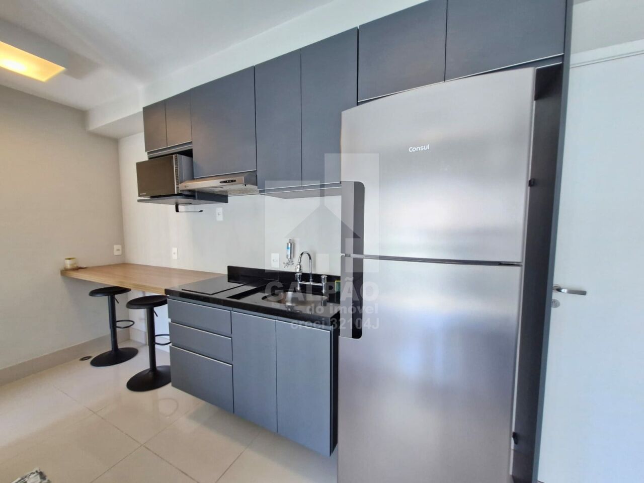 Sala com ar condicionado, varanda envidraçada com sol da manhã, cozinha americana equipada, quarto com armário e ar condicionado, banheiro completo e com armário, 1 vaga de garagem.