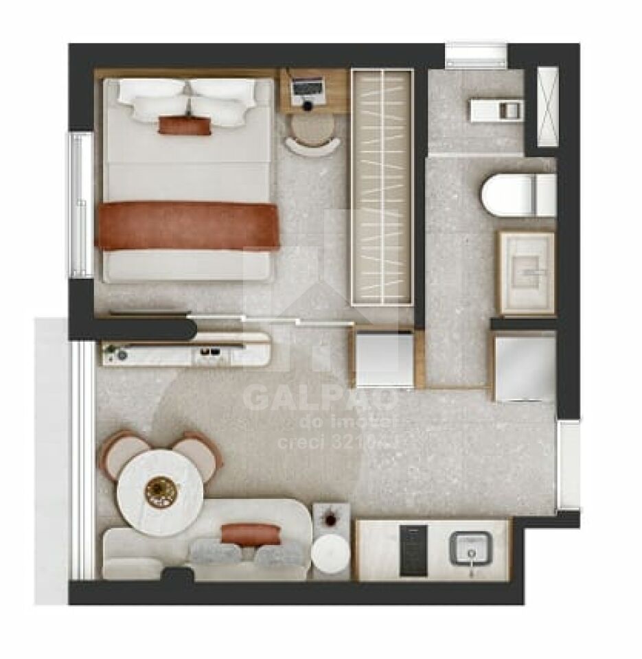 Ideal para estudantes, jovens profissionais ou investidores, o studio conta com cozinha compacta, dormitório integrado, banheiro moderno e acabamentos de qualidade. A planta inteligente aproveita cada metro quadrado, proporcionando um ambiente agradável e acolhedor.
